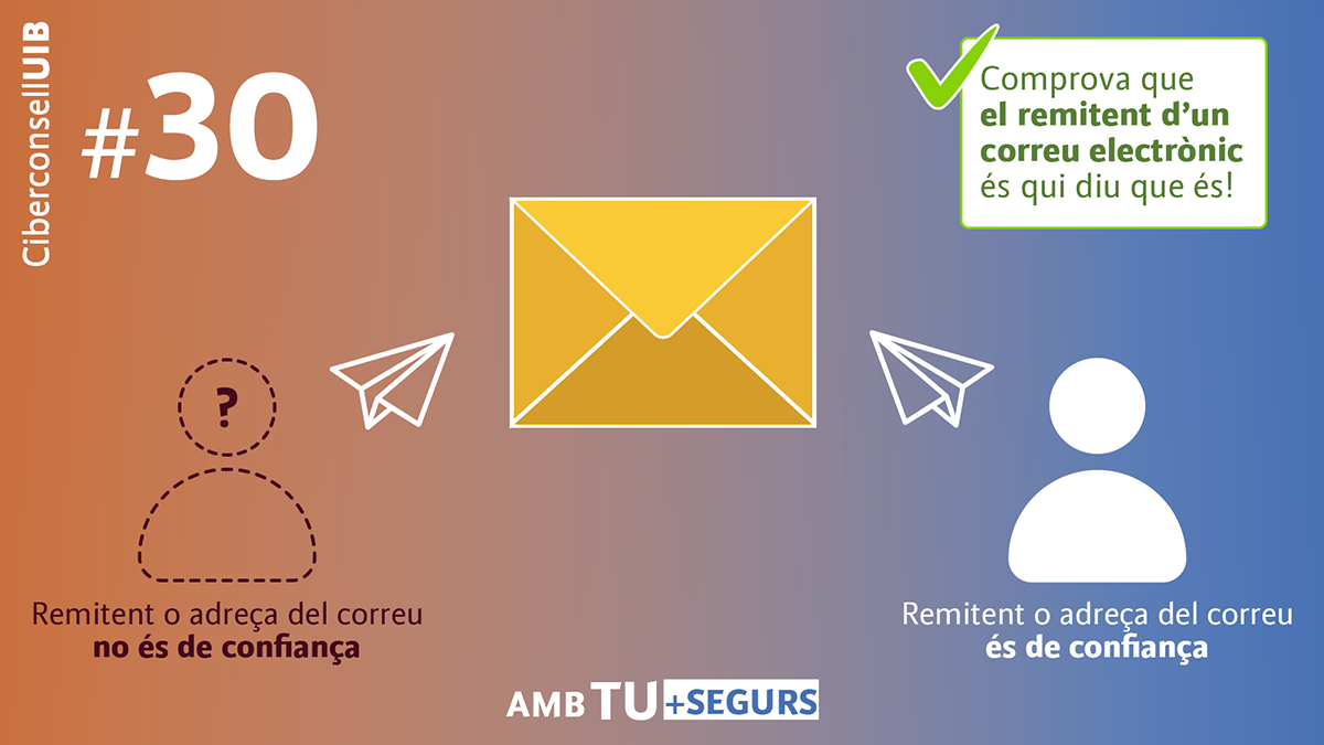 Per això, és important comprovar que qui t’envia un correu és qui diu que és. No confiïs únicament en el nom del remitent; comprova també que el domini o l’adreça del correu rebut és de confiança.